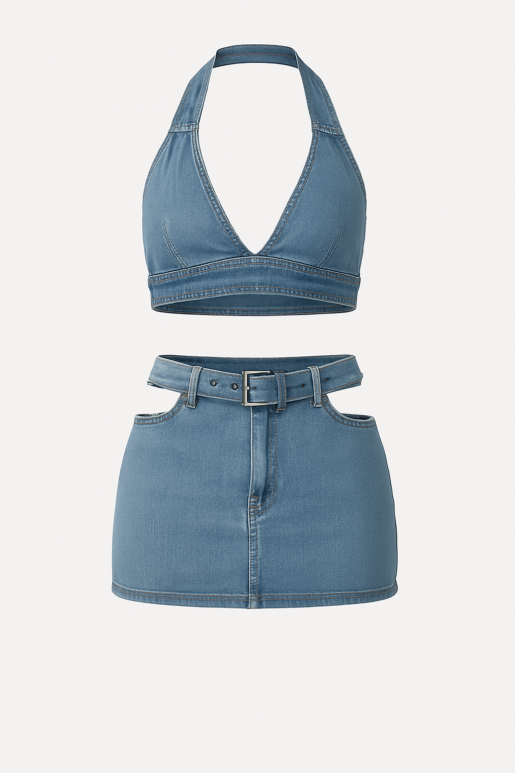 - This daring two-piece denim set includes a deep-cut halter crop top and a matching mini skirt with bold side waist cutouts. Flirty, edgy, and built to stand out — this look delivers main character energy from every angle.