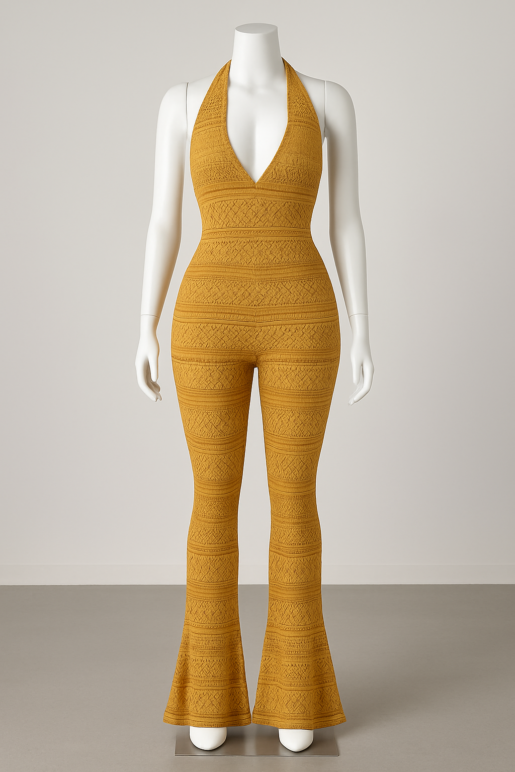 - This mustard knit halter jumpsuit serves body with a backless design, flared legs, and a figure-hugging silhouette. It’s vintage glam with a modern edge — made to own the moment from every angle.